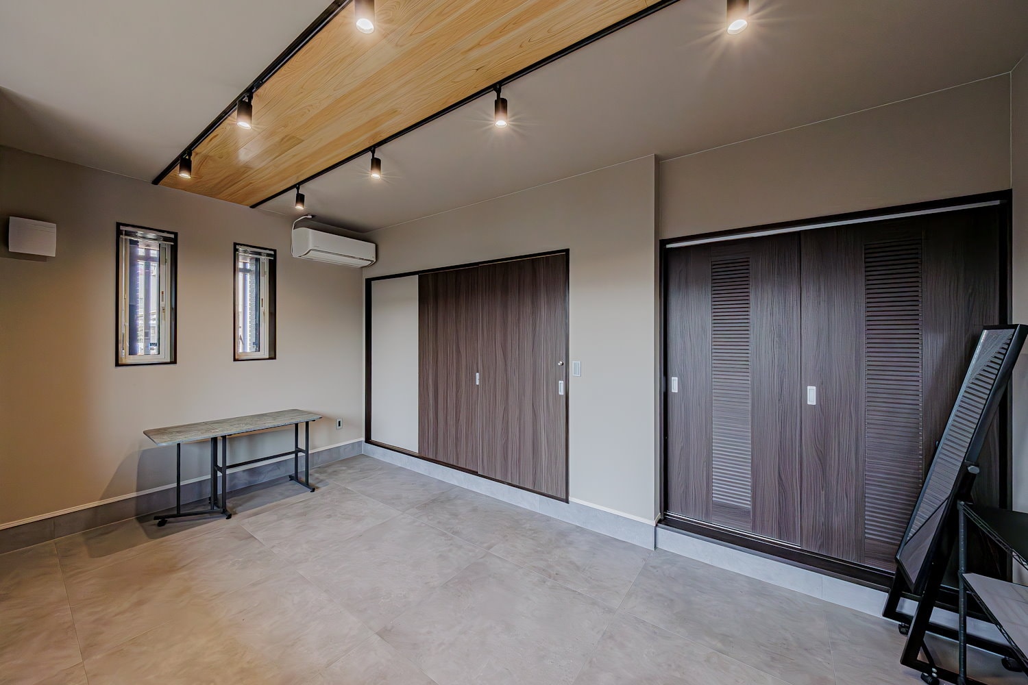 柔らかなベージュやグレーの壁と、直線的なデザインの障子が調和し、和とモダンが融合した憩いの空間。和紙調の照明が温かな光を放ち、癒しのひとときを演出します。