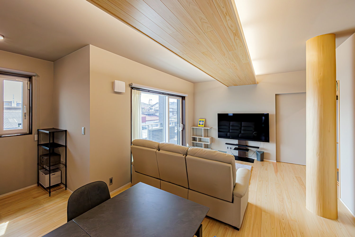 内観には、肌に触れる床や壁、天井に自然素材をふんだんに使用し、住む人の健康を第一に考えた住まいとなっています。化学物質を含まない、クリーンな室内環境を実現しました。