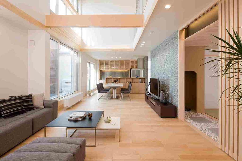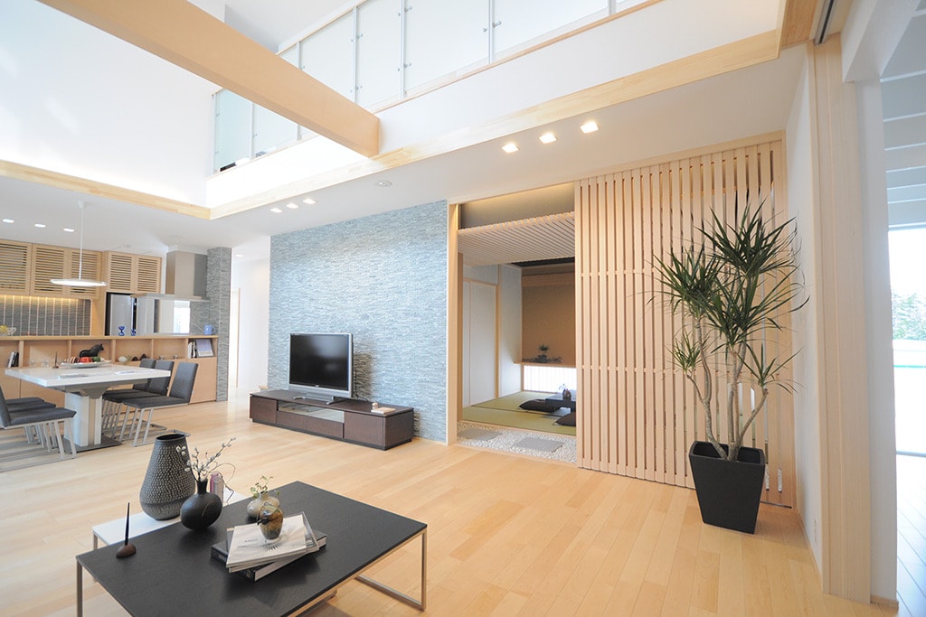 リビングの大きな吹き抜けとオープンテラスが自慢の新築戸建てです。