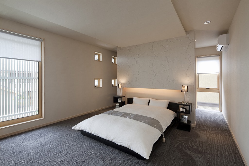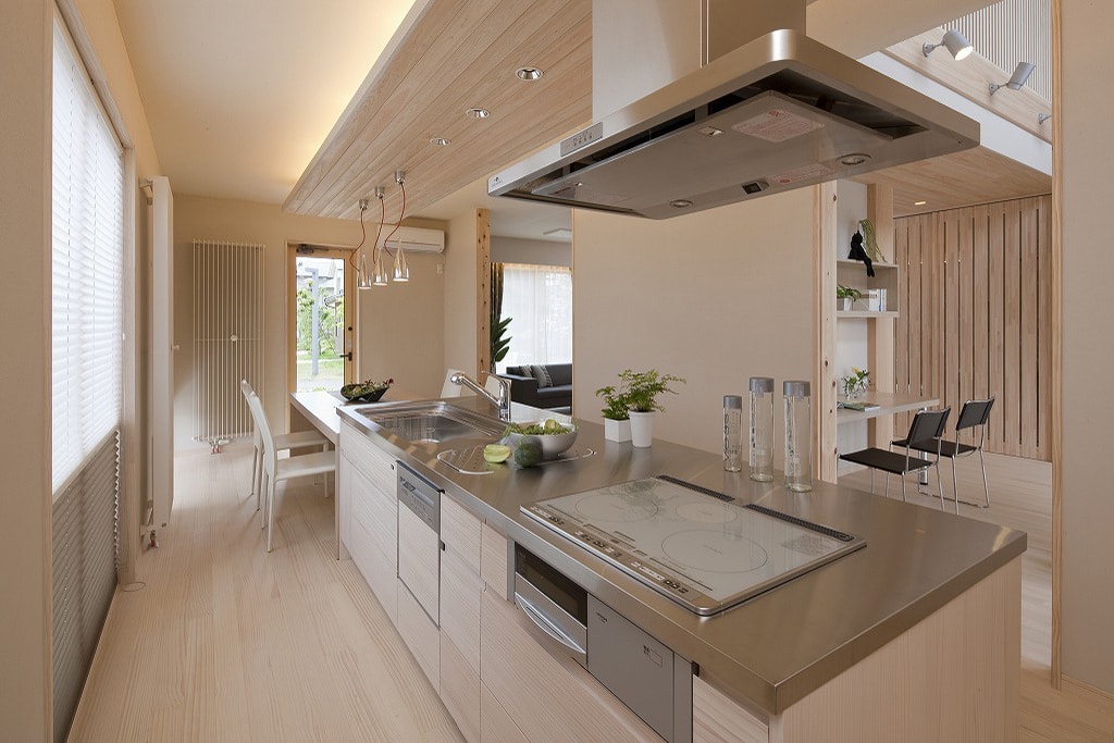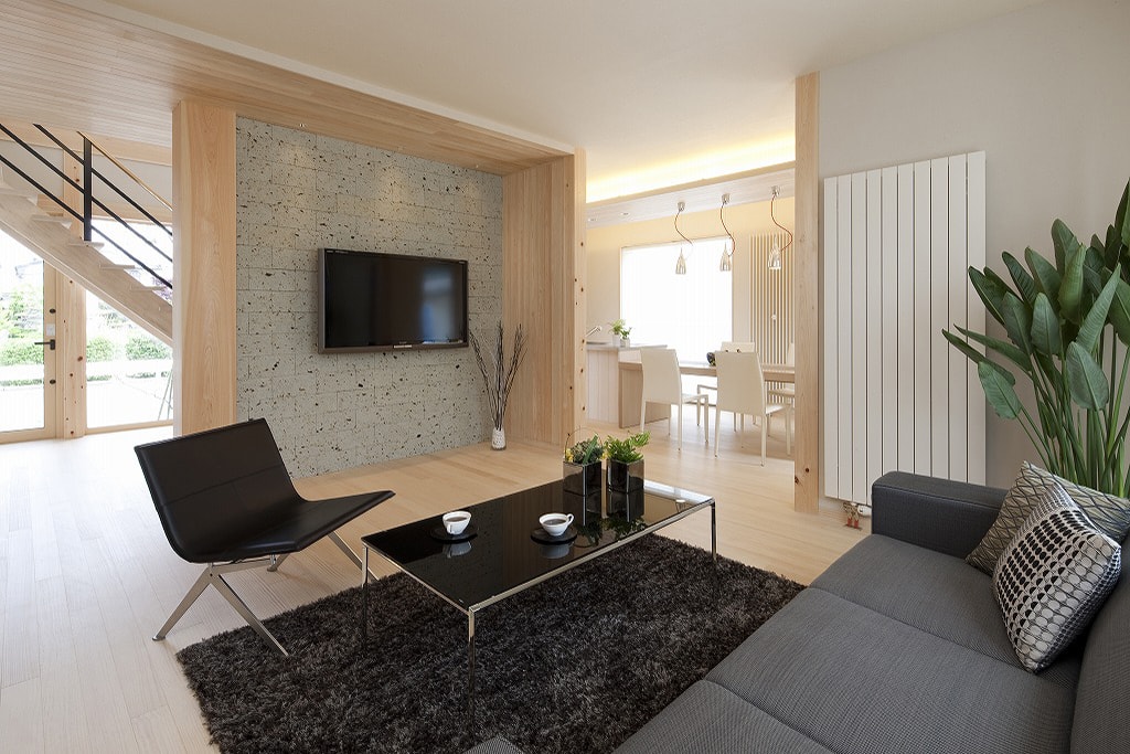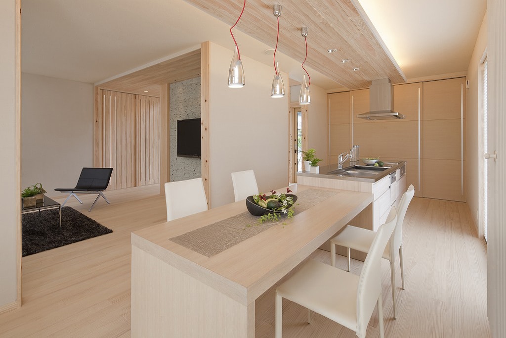 日本人が住まう家だから、本物の自然素材にこだわりました。木肌が美しく、柔らかな質感の無垢材に包まれた空間は、五感に優しく、ワンランク上のリラクゼーション効果をもたらします。プライベートな時間も家族みんなが集まって過ごす時間も満喫できるよう、空間構成に工夫を凝らしました。洋の機能美と和の美意識を兼ね備えた、これからの時代の和モダンの住まいです。