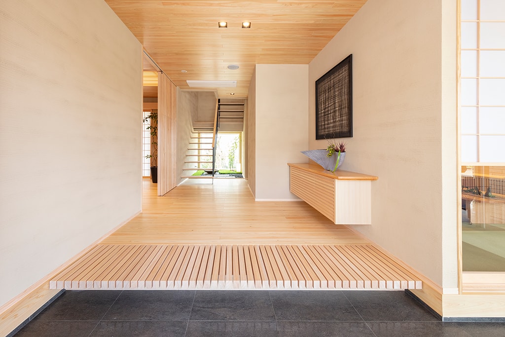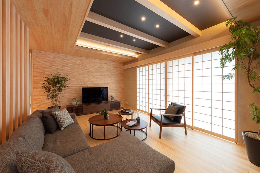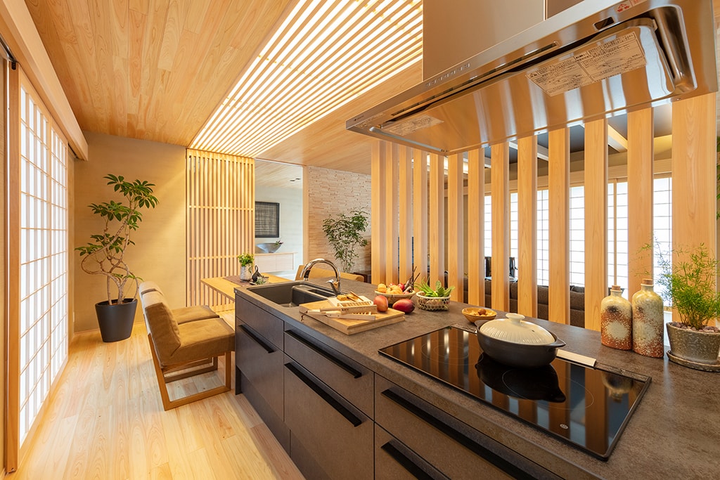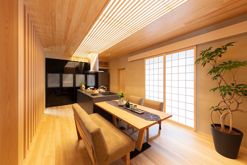 街並みの景観と調和する上質な佇まい。モダンなデザインと和の風格をそえる木目格子。暮らしに新しい美意識を広げる「檜の家」です。