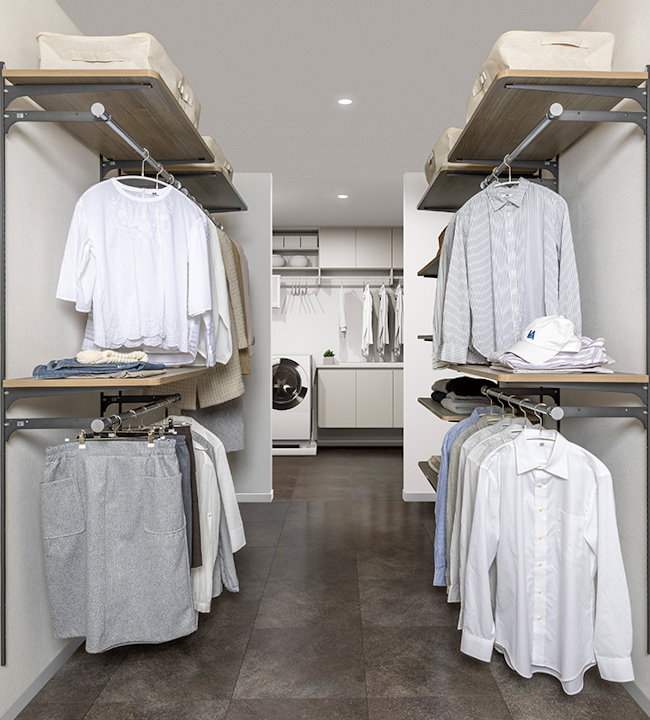 引出しやバスケット、ハンガーパイプを備えた機能的な収納プランで、家族の共有収納としても、個人の収納スペースとしても幅広く活用できます。
