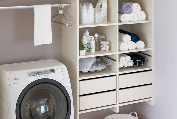 タオルや着替え、下着、洗剤やストック品などをすっきり収納でき、床掃除も簡単。毎日の暮らしがラクになるアイデアが満載です。
