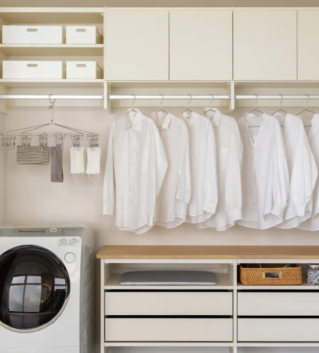 「洗う・干す・アイロンがけ・たたむ・収納する」という一連の洗濯動線を、1ヵ所でまとめて行えるランドリー収納。洗濯アイテムをたっぷり収納できるため、洗濯家事をこの場所だけで完結できます。